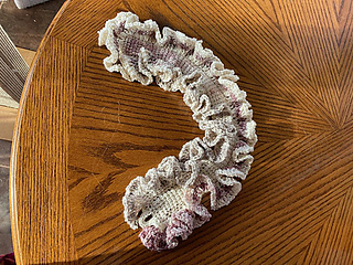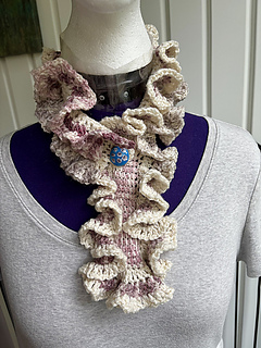 A little wrap around your neck ruffled scarf that closes with a button. You can make it longer, wider, or as a looped cowl if you have more yarn. The center strip of the scarf is made in Tunisian simple stitch with a regular crochet hook and the ruffle is worked around the edges using regular crochet stitches. Add a button loop on one end or not. It’s up to you. The pictured scarf was made with 170 yards of a DK weight yarn and size G/4mm crochet hook. Finished size was 21” long x 4.5” wide unblocked. The two page pattern has written instructions only and no chart. The pattern assumes you know how to work Tunisian simple stitch.