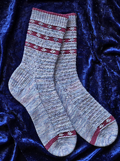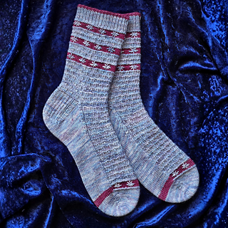 This top-down sock is a lovely textured pattern with striking contrast colour bands and little snowflakes that are hand-stitched. The snowflakes are created with simple straight stitches that give the perfect seasonal touch to this sock.