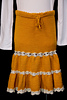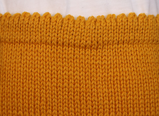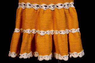 This little girl’s skirt checks all the boxes for me: a cheerful color, an interesting waistband, a new stitch pattern, and some simple stockinette in between. It begins with a provisional cast on. The yarn over/k2tog at the fold line makes a cute picot edge at the top of the waistband, which encloses a drawstring closure for an adjustable fit. The daisy chain is created with multiple yarn overs that are dropped and wrapped on the following round. Since the number of stitches doubles for each tier, the result is a twirly skirt that any little girl will enjoy.