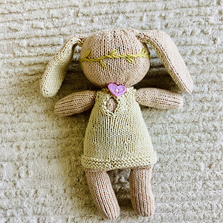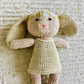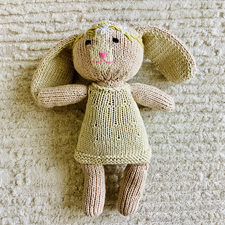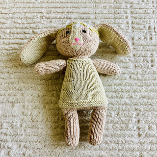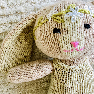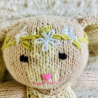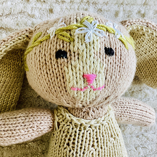 Daisy the Bunny is a sweet stuffed bunny toy with an embroidered Daisy crown. The bunny is worked in the round, with an exception of the ears, which are worked flat in two pieces, and seamed together. The face of the bunny is embroidered using a duplicate stitch, and the other details are added using very basic embroidery stitches: back stitch, satin stitch & Daisy stitch.