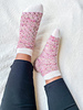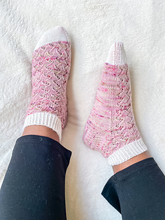 The Dakalo Ankle Socks are knit from the cuff down and work up quickly in an all-over lace pattern. The socks have a heel flap and gusset.