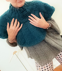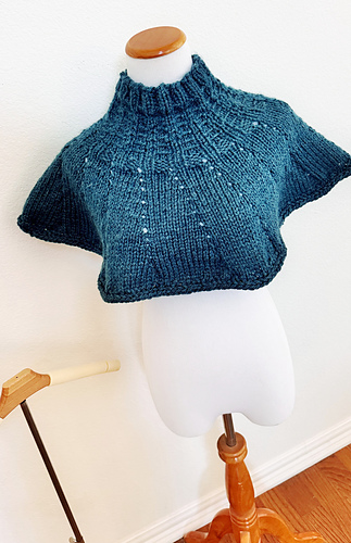 It is knitted top down and all in one piece. The richly textured neck portion is easy accomplished with a simple slip stitch pattern and the body grows evenly all around. The final touch is an I-cord bind off.