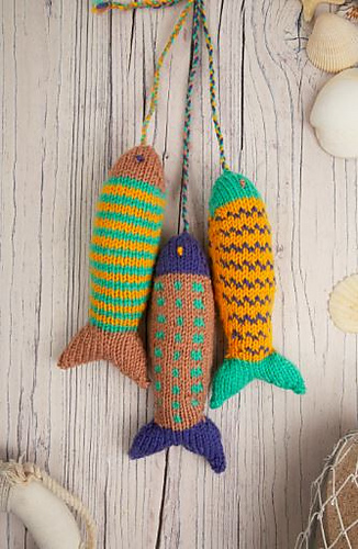 This is a pattern for a decorative fish hanging ornament, originally published in Your Crochet and Knitting. It has a striped, and two Fair Isle fish, shaped and stuffed with toy stuffing with embroidered eyes, and with plaited ties to hang from a hook. The yarn used is a kit yarn and not commercially available, so an alternative yarn matching the colours has been used in the pattern.
