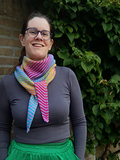 Sample 1 (rainbow version) is made with self striping sock yarn which was dyed to create a sock pair that looks the same. These types of yarn are usually sold in 100 gram or 2x 50 gram quantities. This amount of yarn will turn your project into a lovely shawlette.