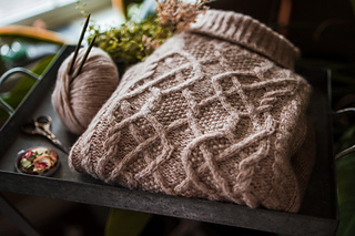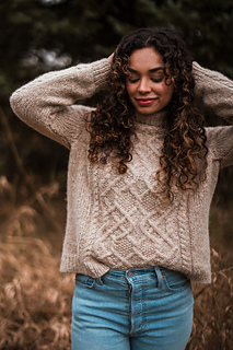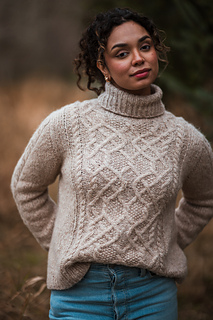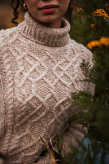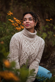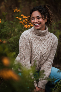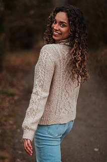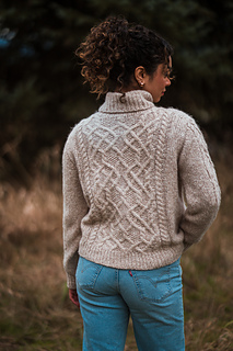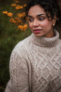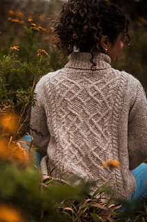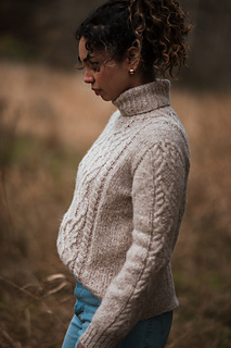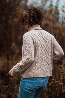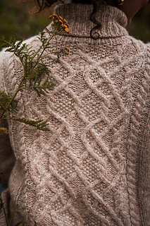 Cables are featured on both the front and back, framed by stockinette side panels that create an easy-to-wear silhouette and flattering drape through the body.
