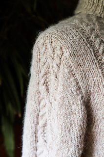 The sleeves are worked in the round and shaped with a short-row sleeve cap for a true set-in sleeve feel, all without seams. A stunning cable detail runs down the side of the arm, and the sleeves finish with a 1x1 ribbed cuff.