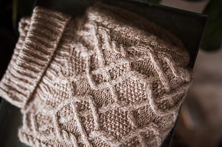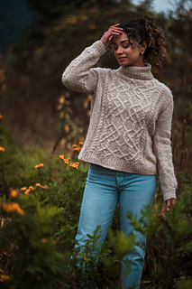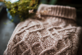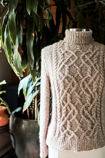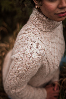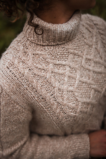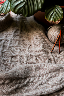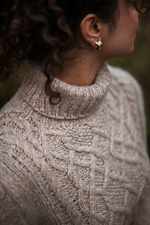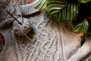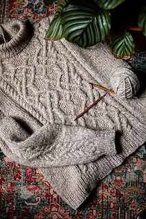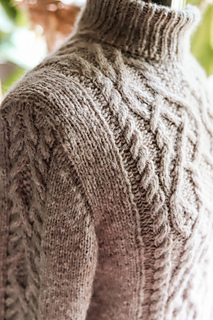 The front and back shoulders are worked flat and shaped with short rows to create a clean, structured shoulder and neckline line. After the armholes, the body is joined in the round and worked straight to the hem, with the cable motifs continuing uninterrupted to the 1x1 ribbed finish.