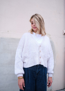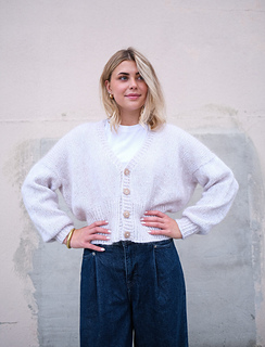 Knitting kit with yarn and free digital knitting pattern. Simple and nice cardigan knitted in one thread Pop merino and 2 threads Hip Mohair. Nice detail with long rib in body and sleeves. Wide fit, normal length body. Knit from the bottom up, back and forth.