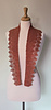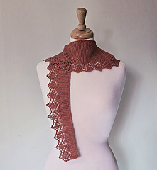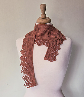 Designed for a small skein of luxury yarn, this shallow, triangular scarf features a lacy stitch pattern on the long, shaped edge, and a simple, 2-stitch wraparound selvedge on the wingspan. Worked on a garter stitch background, the scarf is essentially reversible. These features make the project highly giftable. The small size means it can be knit up quickly while the reversibility means that your recipient doesn’t need to be able to discern between the right side and the wrong side for the scarf to look good when worn. With additional yarn, you might want to experiment with changing the rate of increases and decreases in order to make the scarf bigger—even up to the size of a large shawl.