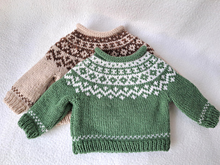 Round yoke style pullover style sweater pattern for most 18 inch dolls. Adorable matching beanie and boot cuffs. Stranded color work in simple fair isle patterns at yoke, hem and sleeve cuffs. Familiar stitches are used, and set can be completed in a few evenings for your favorite little girl to play with!