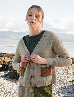 You will need 5 buttons, approximately 3/4” (20 mm) each. Rowan used # TBH3888 zinc coloured metal form Textile Garden in the UK.