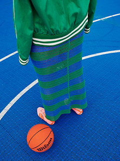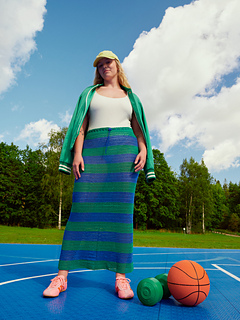 The striped skirt is worked in one piece from the bottom edge of the waistband down to the hem in double crochet. Stripes change color every six rounds. Increases are worked at both sides of the skirt for shaping. A long vertical seam runs down the center back, intentionally visible on the right side. The waistband is finished with an elastic for a flexible fit.