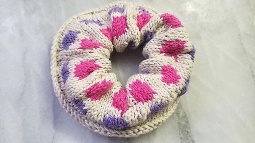 This quick to knit scrunchie is knit in the round with some simple stranded colourwork and then seamed up around a hair elastic. It was designed to match the Dottie Vest for dogs, so the polka dot pattern is identical to the one on the vest. Linked video tutorials of the entire process are included to help you along the way.