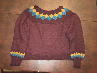 Inspired by tales of dragons, the shaping and colour changes of the yarn in this entrelac yoke are a nod to “dragonscale” armour!