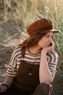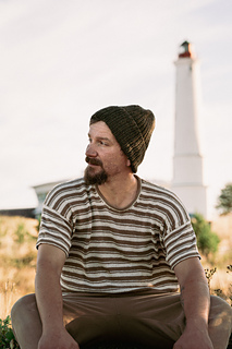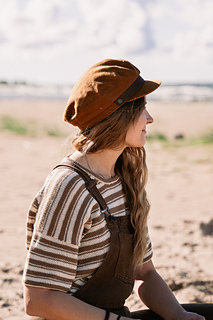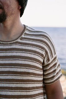 to hem. Then, stitches are picked up around the armholes and the sleeves are worked in the round to the cuff. The shirt features a striped stitch pattern that allows one-row stripes without breaking the yarn while working flat. You can make the T-shirt either as a cropped version or in a regular unisex length.