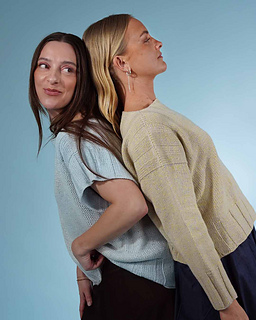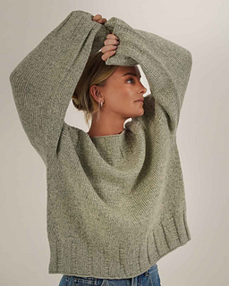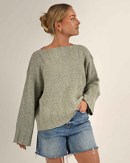 The sweater is worked from the top down. Stitches are first cast on for the front using a long-tail cast-on, and is worked back and forth down to the armhole. The back is shaped by picking up stitches for the shoulders along the cast-on edge of the front, creating the distinct shoulder line. Stitches are then crocheted up for the neck, and the back is worked in the same way as the front, back and forth down to the armhole. The work is then joined to be worked in the round and finished with a wide rib edge. The sleeves are worked in the round from the top down by picking up stitches along the armhole and finished with a wide rib edge.