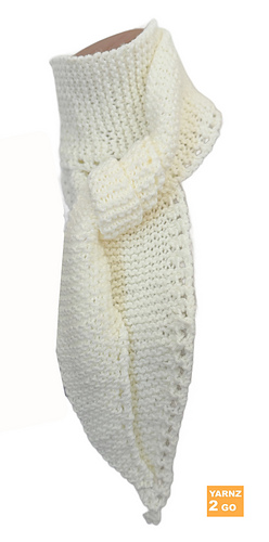 The matching scarf is knitted flat, growing and decreasing at the beginning and again at the end, showing a pretty eyelet detail along one side. The scarf measures 72” in length and 4.5” in width. Written pattern.