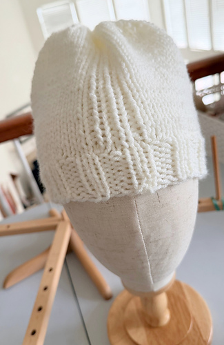 A fun and easy to knit in the round hat with a bit of an extra interest in a five stitch detail for as shown medium size 8” in height, 18.5” around the ribbing. The large size measures 10“ in height, 20.5“ around the ribbing. No bind off, just an easy way to finish the decreased crown. The pattern is entirely written.