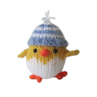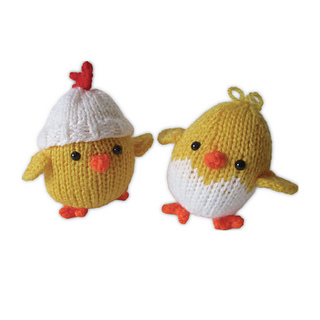 These chicks are egg shaped with little hats, would make a lovely Easter gift if you are looking for a crafty alternative to chocolate. The yellow and white chick uses fair-isle (stranded) colour-work, and written instructions and a chart are provided. Designed by Amanda Berry @fluffandfuzz, the chicks and hats are knitted in acrylic DK yarns on single pointed needles (not in the round).
