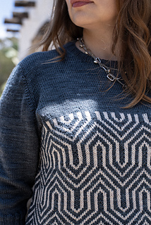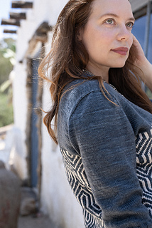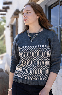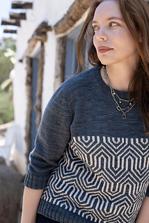 Inspired by the dramatic ridges and sharp contours of Mount Elbrus in the Caucasus, this pullover showcases bold geometric colorwork that echoes the mountain’s angular slopes. The two-tone motif is worked in stranded knitting across the body, with mirrored lines that create depth and movement. Solid stockinette at the yoke, sleeves, and hem provides balance, letting the striking patterning take center stage.