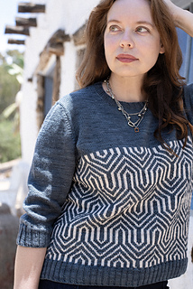 The sweater features a straight body and set-in style sleeves for a comfortable fit, framed with ribbing at the neckline, cuffs, and hem for a clean finish. Worked seamlessly, the design highlights the rhythm of the charted motif while keeping the construction approachable.