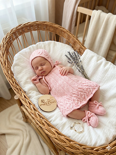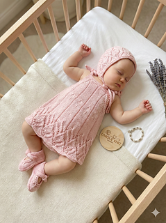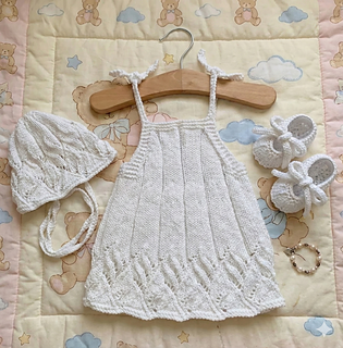The knitted shoes and hat are also tied using knitted straps which are worked into the piece, so very little sewing is required.