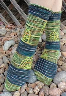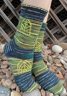 These socks use slipped stitch colorwork and cables to form glowing windows on the leg and a front door on the instep.