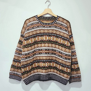 This sweater is a drop shoulder fair isle sweater designed with a classic fit in mind. It is knit starting with the body, bottom-up, and in the round with steeks for the armholes and neck. The shoulders are joined with a 3-needle bind off, and then the steeks are cut open. The sleeves are knit by picking up stitches at the armhole and knitting top down in the round. The collar is then knit by picking up stitches around where the neck steek is cut open.