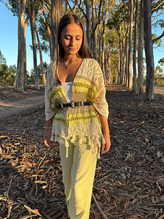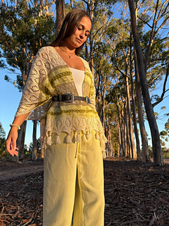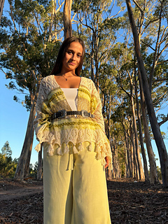 El detalle protagonista es la trenza formada por bucles de i-cord, que aporta volumen y un toque único. La prenda se termina con borlas en los extremos.