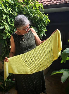 Version 2: Trapazoid Shape: The center back is worked in cable & lace, without short-row shaping at the bottom and worked to a height of 19” approximately and works to a flat bottom edge. Stitches are picked up along both the sides and worked in garter. Decreases are worked on alternate rows along the garter edge to shape the shawl. Finished sizes depth 19” and wingspan 72”74” approximately.