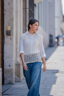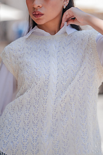 This is a lace panel top with a back slit, worked seamlessly from the top down. First the back is worked, then the shoulders, then the front of the garment and finally the body. Rib edges are worked using two strands held together.