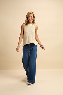 This top is knit seamlessly in the round from the bottom up, starting with a provisional cast on. The cast on is unpicked to create a turned hem. The Front and Back are divided at the armholes and worked flat. The shoulders are joined using a three-needle bind off. Stitches are picked up for the armholes and neck edging and worked in the round.