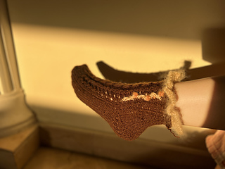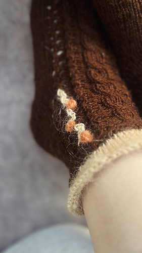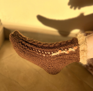 A romantic textured toe-up sock featuring cables, lace, Estonian nupps, and a soft mohair ruffle.