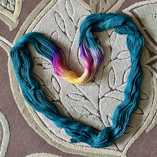 The pattern calls for a single 400g skein of fingering weight yarn. Choose a yarn that is dyed for assigned pooling, with an accent color run of about 8-10”/20-25 cm long. Gauge is not critical, but may affect the size of your cowl, and the amount of yarn needed. Aim for a fabric you like.