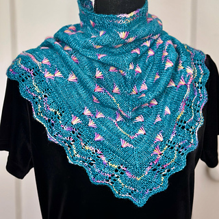 The Fantasia Cowlette is a fingering weight bandana cowl knit in the round, featuring easy assigned pooling fans on a stockinette stitch background.
