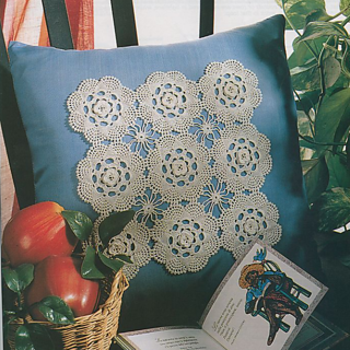 Pillow top has 9 round motifs with flower centers, joined 3 x 3 with four small fill-in motifs.