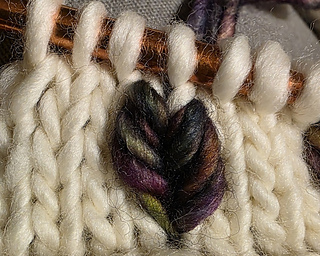 I love working with this technique. In some books it is called a dip stitch, in others it is called a drawn stitch. I just call it fabulous. It is like an embroidery stitch in that it is applied to a surface, except that you work (apply) it with a knitting needle as you knit the rest of your project.