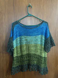 Techniques: Knitted in the round, placing section on hold, knitting flat in stockinette stitch, lace, garter stitch, minimal seaming and color changes.