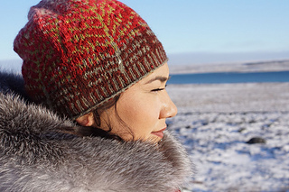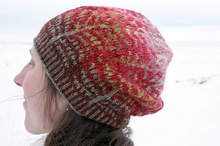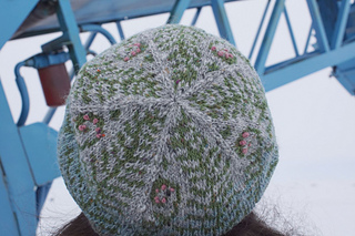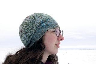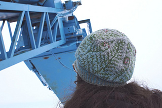 This hat is worked in the round from the bottom up following a colourwork chart. After a decorative cast on and a small corrugated ribbing section, the chart flows up the hat, changing shades to create a gradient effect in both foreground and background. The wide pattern repeats around the hat five times. Modified French knots can be added at the end for an optional embellishment.
