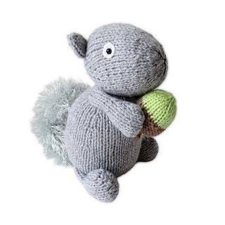 Finsbury Squirrel is busy today collecting acorns so they won’t go hungry this winter. This squirrel uses a fluffy eyelash yarn to make the tail. Designed by Amanda Berry @fluffandfuzz, the squirrel and acorns are knitted in DK yarns on single pointed needles (not in the round). The acorn stalk is an i-cord tube worked on the two DPNs.