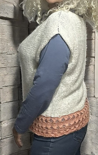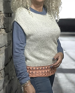 Fiori di Pesco è una maglia lavorata in top down con costruzione contiguous. Dopo un piccolo bordo, la profondità dello sprone verrà lavorata separatamente e in piano. Poi si riuniranno le due parti e si lavorerà in tondo fino alla fine. Lo scalfo manica grazie al tipo di vivagno utilizzato non richiede di essere rifinito. La lavorazione è prevalentemente a maglia rasata dritta. Alla fine del corpo si cambia colore e si inserisce un punto fantasia.