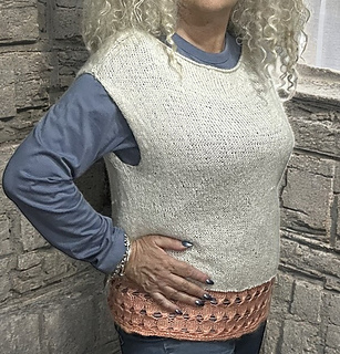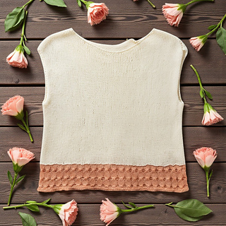 Fiori di Pesco is a top-down sweater featuring a contiguous construction. After working a small edge, the yoke depth is worked flat and separately. The two sections are then joined, and the garment is worked in the round to the hem. Thanks to the selvedge technique used, the armholes do not require any finishing. The sweater is worked mainly in stockinette stitch. At the end of the body, a color change is introduced together with a decorative stitch pattern.