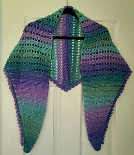 This simple, triangular shawl shines in a self-striping, metallic yarn.