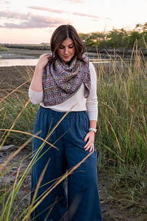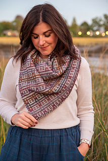 The Flannel Crush Shawl features an allover mosaic colorwork pattern, with only one color used at a time. This triangle shawl is worked flat beginning at one corner and shaped with increases along one edge, resulting in an asymmetrical triangular shape. The shawl has built-in I-Cord edges and an I-Cord bind off.
