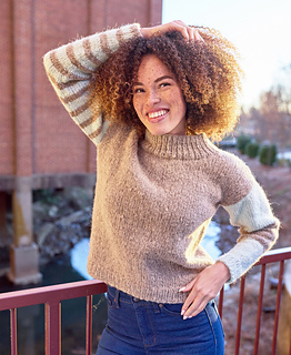 This slightly cropped Sweater is knit flat in pieces and seamed together. It features a simple drop sleeve construction, mock turtleneck, and different striping on each sleeve. When changing colors in the Left Sleeve, cut colors and weave in ends at each stripe. When changing colors in the Right Sleeve, leave both colors attached throughout, carrying the unused strand loosely up the side of the work. This Sweater is intended to fit with 4-8” of positive ease. Choose a size that is 4-8” larger than your actual bust size.