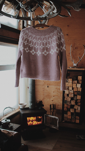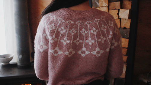 This boxy top-down jumper is knitted in the round and features a seamless construction and stranded yoke. It comes in ten adult sizes with customization options for body length, sleeve length, and bust shaping.