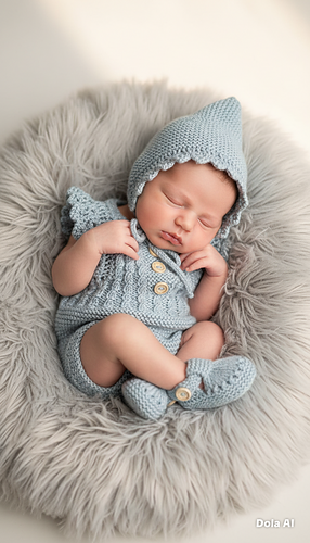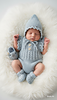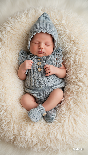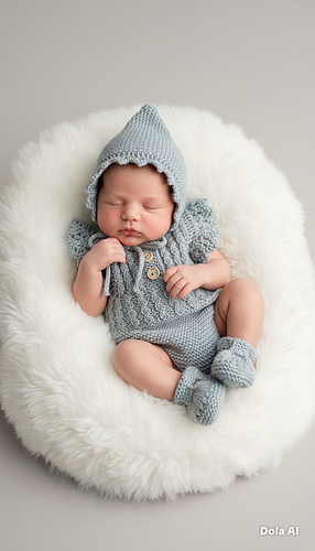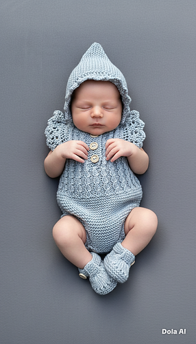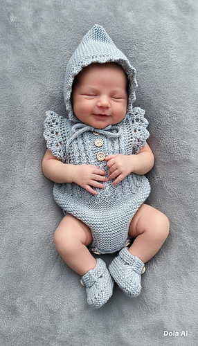 This pretty lace-sleeved romper set is very easy to make despite the detail. The romper is knitted from the gusset up, it then opens for the neck and continues down to work the back.