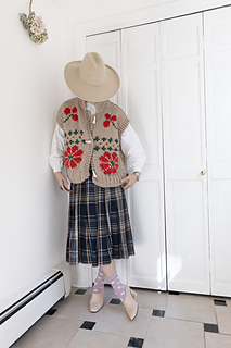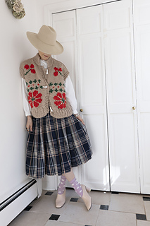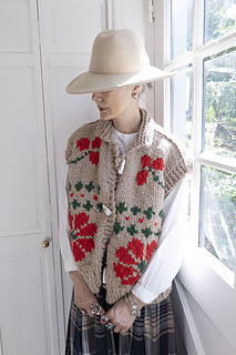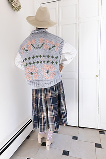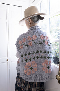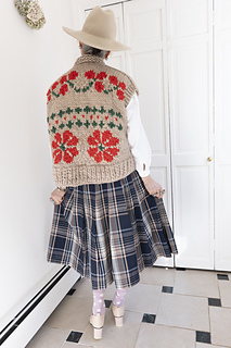 This vest is knit in three panels (two front and one back) that are seamed together at the shoulders and on the sides leaving arm openings. Panels are knitted flat from bottom up. All panels can be knit either on straight or circular needles. Collar is knit by picking up stitches around the neck. All panels feature stranded colorwork throughout. Tip: this project uses super bulky yarn for colorwork - you don’t have to carry the yarn for the rows or sections (edges of each panel) where MC or LC color is not used to prevent the garment from getting too heavy.