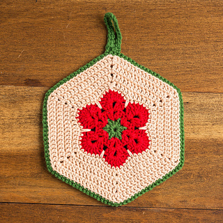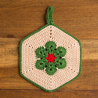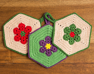 Hexagon is worked in the round from center out. Dishcloth consists of one hexagon edged with single crochet, then finished with a hanging loop. Trivet consists of two hexagons joined together with single crochet, then finished with a hanging loop.