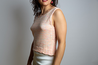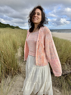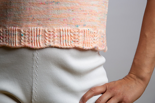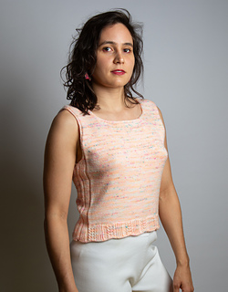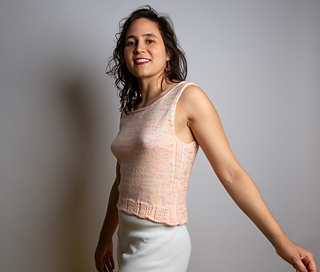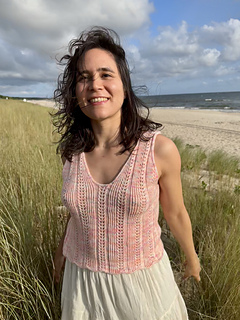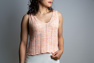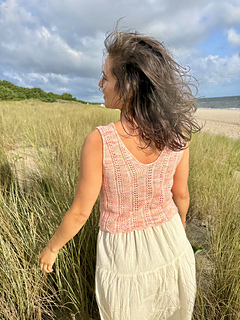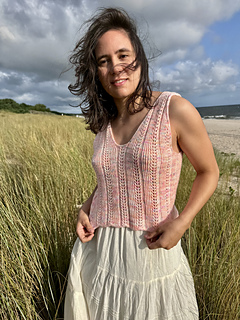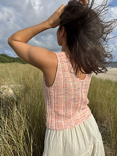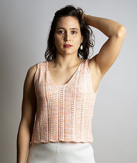 Das Design zeichnet sich durch ein einfaches, aber wunderschönes Lochmuster mit verschränktem Rippenmuster sowohl auf der Vorder- als auch auf der Rückseite aus. I-Cord-Kanten rahmen das Oberteil ein. Das Garn hat einen sehr schönen Fall, der perfekt zur kastigen Passform des Oberteils passt und ihm gleichzeitig eine feminine Note verleiht.